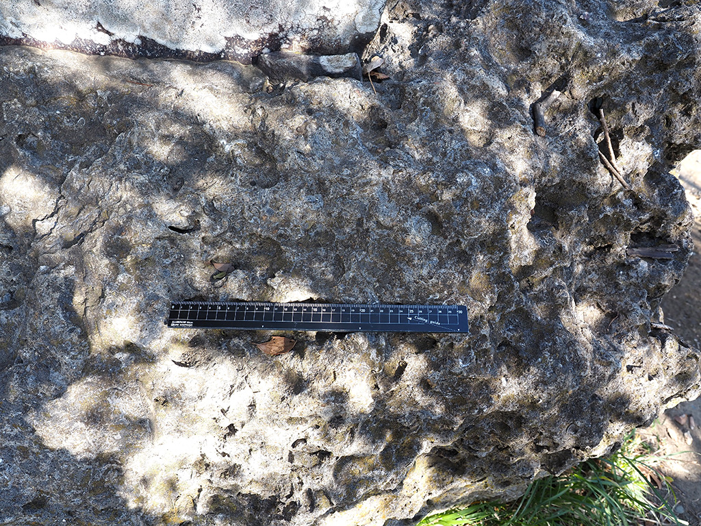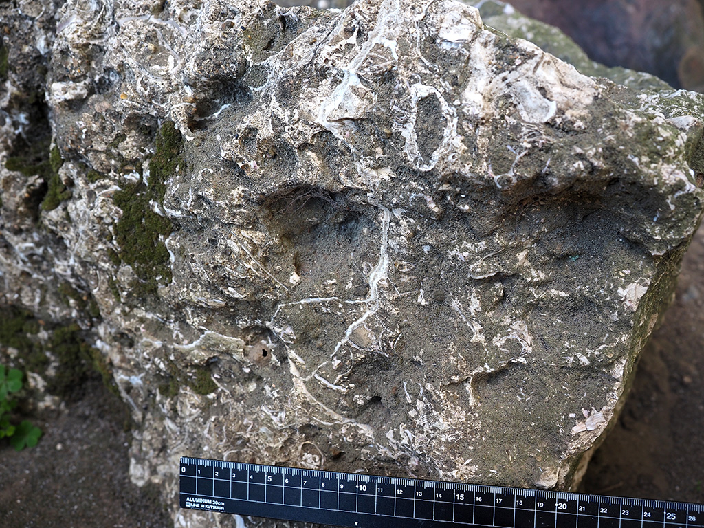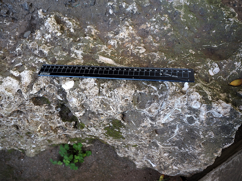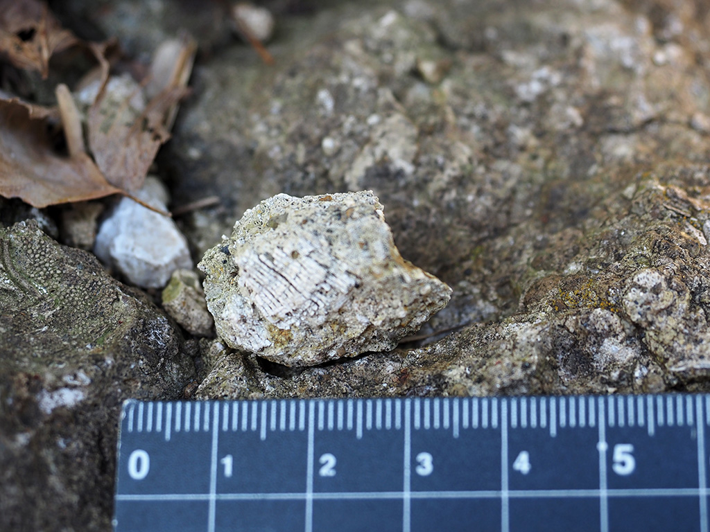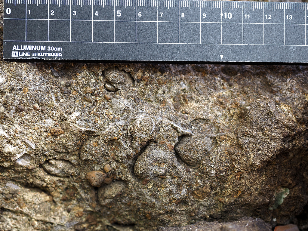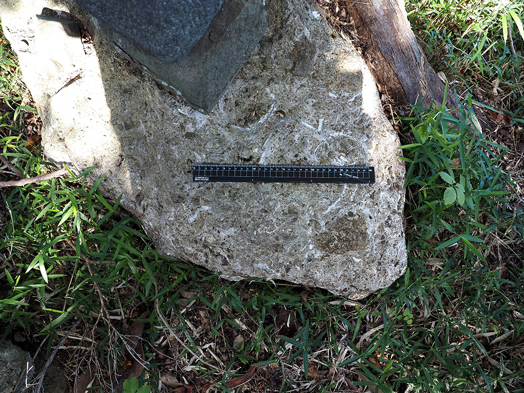 宮田貞明館址碑脇の初声層化石密集層岩塊の単体サンゴ化石 TOP