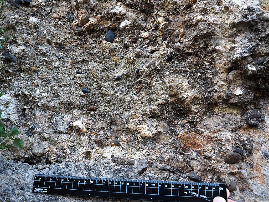 宮田層基底礫層は扁平な円礫と亜角礫が混在しておりマトリックスは弱くコキナ状に貝殻が密集し単体サンゴも含む TOP
