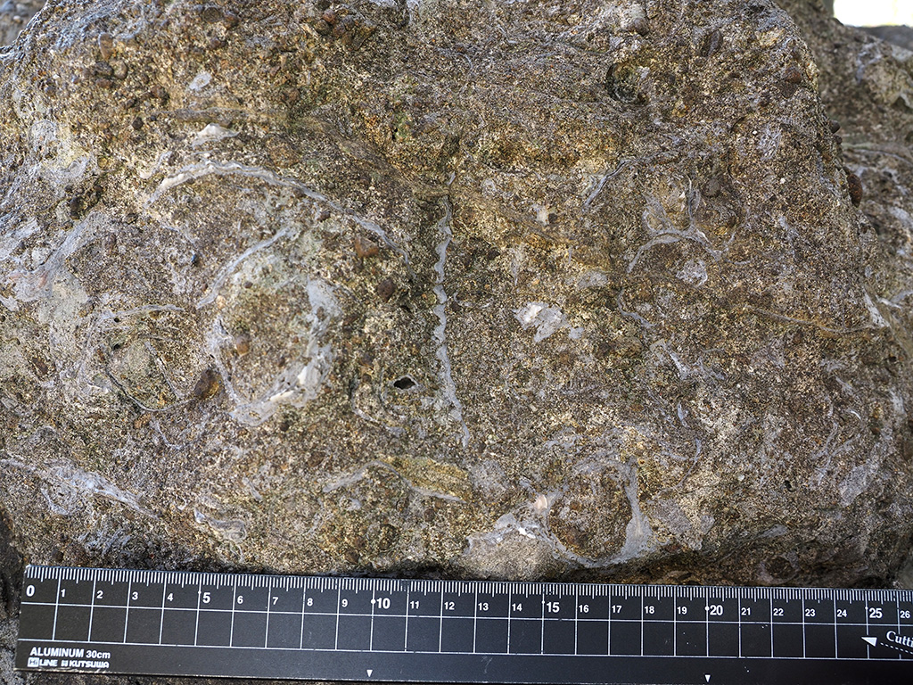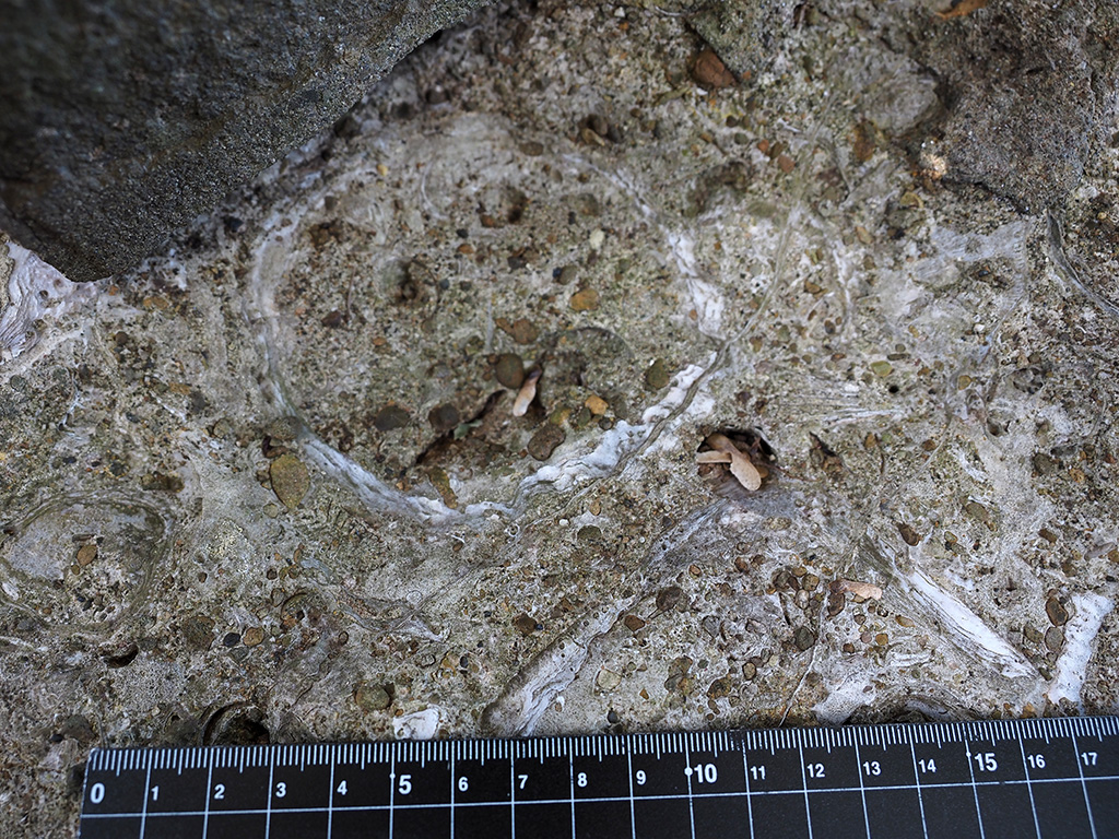 宮田層基底礫層中の不定形で白色の塊が何かは不明(露頭面で形成されたものの可能性有り) TOP