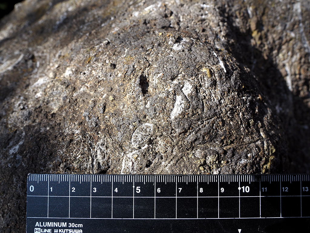 宮田貞明主従墓域の五輪塔?の初声層化石密集層台座石のミウラニシキガイ化石のリング状断面 TOP