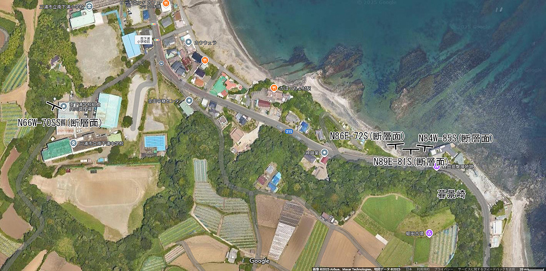 GoogleMap(35.171978N,139.658790E) 断層面の走向・傾斜 N84°W・85°S