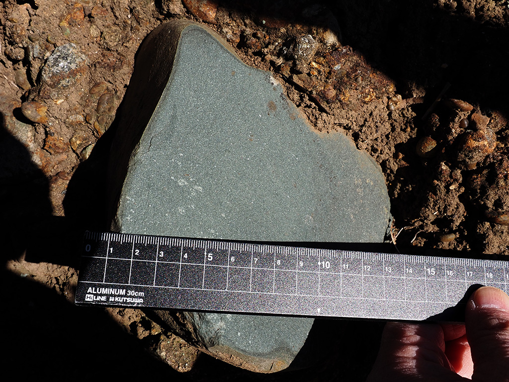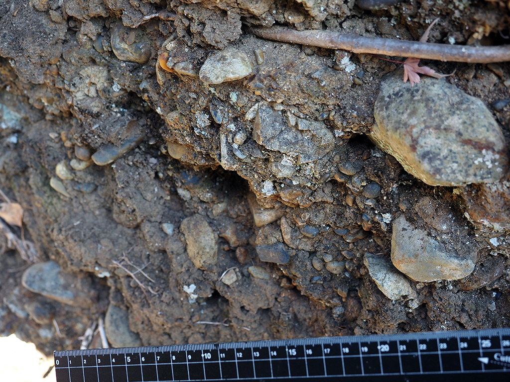 五重塔付近より上位側で、円磨度がより高く扁平礫が少ない。