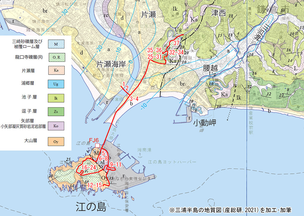 神奈川県藤沢市江の島の地質調査実習における地層と地形の観察-葉山層群と三浦層群の観察の手引き-(小沢ほか, 日本大学 生物資源科学, 2020)